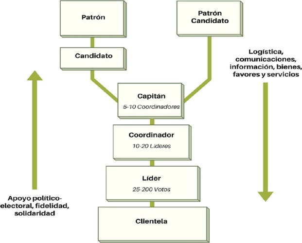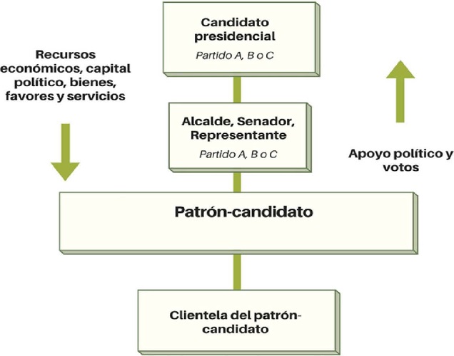 La Figura 1 muestra el esquema clientelar de la escala descendente. En dicha figura hay 2 tipos de patrón: a) el que pone o apoya a un candidato; y b) el patrón-candidato. El tipo de patrón importa en el sentido que fluye la red. Como se aprecia en dicha figura, un patrón está al frente de una maquinaria clientelar que fluye por debajo de él conformada por 3 anillos de mediadores, quienes, a su vez, actúan como intermediarios entre el candidato y el electorado. La personalización de la política y las necesidades de la población han promovido que la atención de demandas –desde las inmediatas hasta las más complejas– pase ineludiblemente por la intervención de mediadores políticos.