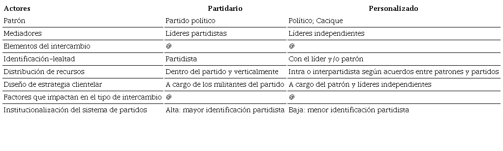 Por último, es importante señalar que la distinción entre clientelismo partidario y clientelismo personalizado atiende a tipos ideales, por lo que las características que adopte uno u otro en la práctica dependerán también de factores contextuales y coyunturales. De tal manera que variables como el sistema electoral, la competitividad electoral, el nivel de descentralización administrativa y política, los acuerdos políticos y la cultura ciudadana pueden propiciar que algunos de los elementos abordados se solapen mutuamente, generando modelos más bien mixtos.
