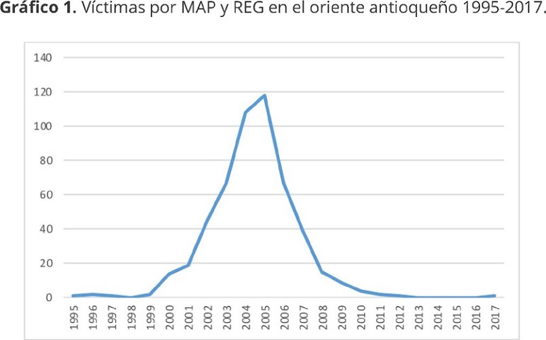 Estos tres municipios conforman la denominada zona de Bosques del Oriente Antioqueño. Ubicada a escasos 80 km de Medellín, se trata de una región que ha tenido presencia guerrillera desde la década de 1970, especialmente la del Ejército de Liberación Nacional (ELN), a través del frente de guerra denominado Carlos Alirio Buitrago. La región también tuvo presencia de las Fuerzas Armadas Revolucionarias de Colombia (FARC), organización que, a través de sus frentes 9 y 47, le disputó el dominio al ELN desde mediados de los años 1980. En la década siguiente haría su entrada violenta las Autodefensas Campesinas de Córdoba y Urabá (ACCU), facción paramilitar de ultraderecha que empleó las masacres indiscriminadas como forma central de su accionar en la guerra colombiana. La zona también fue escenario de grandes operativos militares: entre los años 2003 y 2006, el Ejército colombiano lanzó allí al menos 5 grandes ofensivas contra el ELN y las FARC (SANDOVAL et al., 2017). El hecho de ser zona de disputa entre distintos actores armados hizo que el empleo de MAP aumentara allí, ya que estas armas han sido empleadas en Colombia especialmente por las fuerzas guerrilleras como estrategia defensiva en momentos de operativos militares del ejército o de las organizaciones paramilitares (CNMH, 2017).