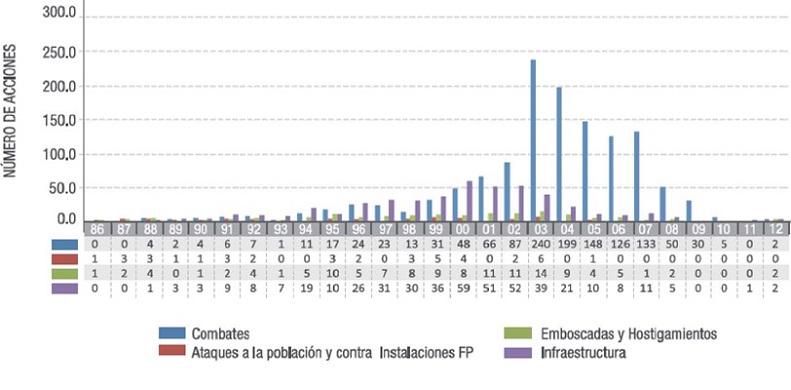 A partir del año 2000, la afectación por MAP y REG empieza a crecer en la región del oriente antioqueño, llegando a su punto más alto en el año 2005. Este periodo de agudización coincide con la etapa en la que las Fuerzas Militares retomaron la iniciativa en la región, mediante el desarrollo de los operativos militares indicados en la introducción. El Gráfico 2 muestra los combates que tuvieron lugar entre la Fuerza Pública y los grupos guerrilleros por iniciativa de la primera (es decir, en el contexto de operativos militares) y las acciones de guerra de la guerrilla en el oriente antioqueño. Si comparamos el Gráfico 1 y el Gráfico 2, se confrma que el periodo de mayor victimización por MAP y REG coincide con el de los operativos militares de la Fuerza Pública.