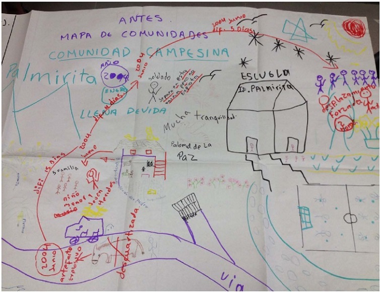 Cuando las mujeres de Cocorná, participantes en los talleres de memoria, realizaron el ejercicio de cartografía social de reconstrucción de su territorio, plasmaron claramente esta relación. La Imagen 1 narra una experiencia colectiva: se trata de un mapa de afectación de MAP construido por ellas, en el cual se registra la continuidad entre la victimización por MAP y el desplazamiento forzado; la línea roja que comienza en un evento por minas en el año 2004 (abajo a la izquierda en la imagen) termina en un desplazamiento forzado en el cual tuvieron que caminar por espacio de dos horas los pobladores de la vereda que huyeron aquel día. La línea roja conecta así varias activaciones de MAP, separadas apenas por días, con ese acontecimiento final, en una causalidad que en el dibujo se presenta incluso de forma directa.