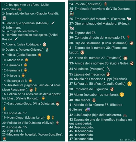 Nuestros informantes dicen sospechar quién pudo haber sido la persona que confeccionó esta lista, aunque –siguiendo una lógica muy común del rumor– no han precisado nombres. Cuando les preguntamos qué pensaban de que circularan estos datos, algunos de ellos nos dijeron que, quien fuera que los hubiera compilado estaba haciendo, en última instancia, lo mismo que hacía el Estado, a saber, controlar los casos de COVID-19 para ejercer un cuidado de la ciudadanía.