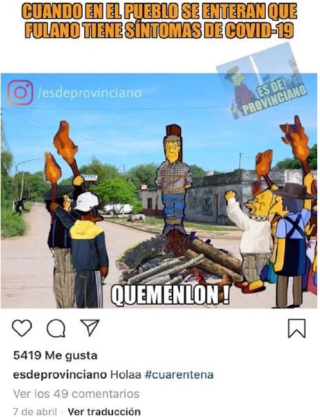 En este comentario, los deberes o las obligaciones hacia los demás, característicos de las vinculaciones jerárquico-relacionales que impregnan estas localidades “donde todos se conocen”, quedan traducidas al repertorio del “cuidado comunitario” –sobre el cual nos hemos explayado en el apartado anterior. En vistas a “cuidar la salud”, se propone reforzar el carácter “anti-anónimo” que ya era propio de estos medios sociales desde tiempos previos al COVID-19. Así, nombrarse y nombrar a los demás como contagiados parecen configurarse como una forma folk de gestionar la pandemia y cuidar la salud y la proliferación de la enfermedad. En línea con la propuesta de la mujer recién citada, un vecino de uno de los distritos en los que trabajamos presentó en un medio de comunicación local una propuesta para que el gobierno municipal divulgara las zonas de residencia de los infectados, lo cual, en un contexto urbano de este tipo, sería prácticamente lo mismo que dar nombres, apellidos y señas personales: