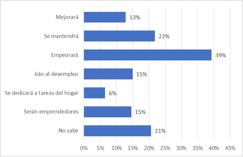 En el ámbito laboral, las expectativas no son alentadoras, ya que el 39% considera que la situación laboral luego de la pandemia empeorará, el 15% piensa que irá al desempleo, y el 6% se dedicará a tareas del hogar. El desglose se presenta en el Gráfico 1. Esto se podría agravar de mantener la aplicación de políticas de ajuste estructural (KING y SAMANIEGO, 2020). La incertidumbre en materia laboral es del 21%.