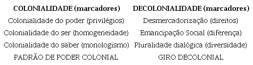 Diante disso construo o Quadro 1, em que se localizam os elementos tanto da colonialidade como da decolonialidade, assim como os marcadores sociais correspondentes. Estes últimos são referências importantes que tratam de representar como a colonialidade e a decolonialidade se estabelecem na realidade social. Por exemplo, a manutenção da colonialidade do poder promove privilégios a poucos e, para confrontá-la, é necessário desmercadorizar a vida social, possibilitando o acesso a direitos coletivos de forma equânime.