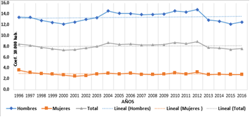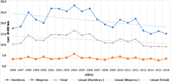 Se puede observar que, entre 1996 y 2016 en el Estado de Paraná existió un comportamiento estable en la Tendencia de Mortalidad. El sexo masculino presentó una tendencia más elevada en relación a las mujeres (promedio de 13,4 a 2,9 óbitos por 10 000 habitantes). En tanto, en el Municipio de Foz de Iguazú, fue observada una disminución en la tendencia, en ambos sexos con promedios de 21,5 y 3,8 por 10 000 habitantes respectivamente (Paraná, Total: 0,006; Hombres: 0,019; Mujeres: -0,009), (Foz, Total: -0,17; Hombres: -0,319; Mujeres: -0,319) (Figura 1 y Figura 2). Los coeficientes de regresión de las tasas de mortalidad por causas externas por sexo en Foz de Iguazú y Paraná de 1996 a 2016 se aprecian en la Tabla 1.
