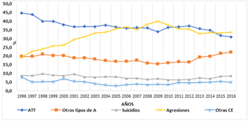 Un estudio similar, las agresiones permanecieron como la causa específica responsable por la mayor tasa de mortalidad, sin gran variación a lo largo del período. A seguir, las tasas de mortalidad por ATT ocuparon la segunda posición entre las tasas de mortalidad por causas externas, presentando evolución creciente (25,7 % de 2000 a 2013), especialmente a partir de 2010, aunque con las menores tasas de mortalidad, las caídas y lesiones autoprovocadas presentaron una evolución también creciente en el período, con un aumento de 148 % y 33,3 %, respectivamente, entre 2000 y 20136).
