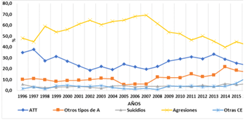 En cuanto a la mortalidad proporcional de los grupos de causas externas más importantes de los 21 años de estudio, según figura 3 y 4 se observa que en el Estado de Paraná la primera causa de muerte con el 36,8% corresponde a ATT, agresiones 32,6% y otros tipos de accidentes 18,8%, del total de los óbitos del periodo estudiado. Con relación al Municipio de Foz de Iguazú las agresiones representan la primera causa de muerte con el 56,3%, ATT el 25,5% y otros tipos de accidentes 10,9 de los óbitos (Figura 3). En la Figura 4 se aprecia Mortalidad proporcional por grandes grupos de causas externas en el Municipio de Foz de Iguazú, 1996 a 2016.