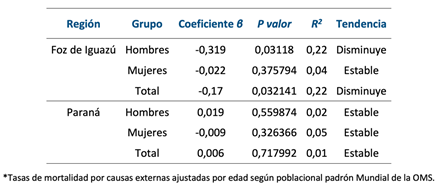 Resultados: Las tendencias de mortalidad por causas externas en el periodo de 1996 a 2016 en el Estado de Paraná fue estable y en el Municipio de Iguazú mostró disminución; el promedio en las tasas de mortalidad de 8,7 y 12,4 por 10.000 habitantes para Paraná y Foz de Iguazú respectivamente. Las causas más importantes de muerte en el inicio del estudio fueron Agresiones y Accidentes de Tránsitos tanto para Paraná como para Foz de Iguazú, con mayor índice en las edades de 15 a 29 años en ambos sexos, con diferencia al final del estudio donde la primera causa de muerte en hombres es agresiones con índices mayores en edades de 15 a 29 años y otras lesiones por accidentes en mujeres de 60 años y más.