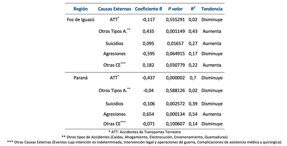 A partir del coeficiente de regresión de los grupos de causas externas en los años de estudios se observa que en el Estado de Paraná tanto como en el Municipio de Foz de Iguazú, los casos de accidentes de tránsitos han disminuido, con relación a otros tipos de accidentes en Paraná la tendencia disminuye, con diferencia de Foz de Iguazú que está en aumento. Agresiones en el Estado de Paraná aumenta con diferencia de Foz de Iguazú que disminuye. Suicidios y Otras causas externas en Paraná está en disminución, con relación de Foz de Iguazú que va en aumento (Tabla 2).