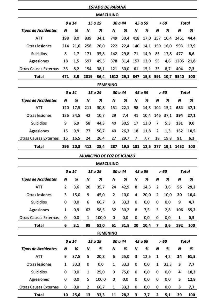 Según este estudio en cuanto a la mortalidad proporcional de los grupos de causas externas más importantes de los 21 años de estudio, según figura 3 y 4 se observa que en el Estado de Paraná la primera causa de muerte con el 36,8 % corresponde a ATT, agresiones 32,6 % y otros tipos de accidentes 18,8 %, del total de los óbitos del periodo estudiado. Con relación al Municipio de Foz de Iguazú las agresiones representan la primera causa de muerte con el 56,3 %, ATT el 25,5 % y otros tipos de accidentes 10,9 de los óbitos. Se verificó, por ejemplo, que muchas víctimas de ese tipo de evento buscaron atención en más de un servicio de salud. La proporción de atención previa por la misma causa externa varió de 6,6 % en Boa Vista/RR a 50,6 % en Victória/ES. En la atención por accidentes, la proporción de eventos relacionados al trabajo (accidentes de trabajo) varió de 21,2 % en Macapá/AP a 44 % en Curitiba/PR. Para el total de atenciones (accidentes y violencias), esa proporción varió de 9,5 % en Macapá/AP a 24,9 % en Salvador/BA. Otro dato importante fue la proporción de ingestión de bebida alcohólica en las seis horas anteriores al evento1.