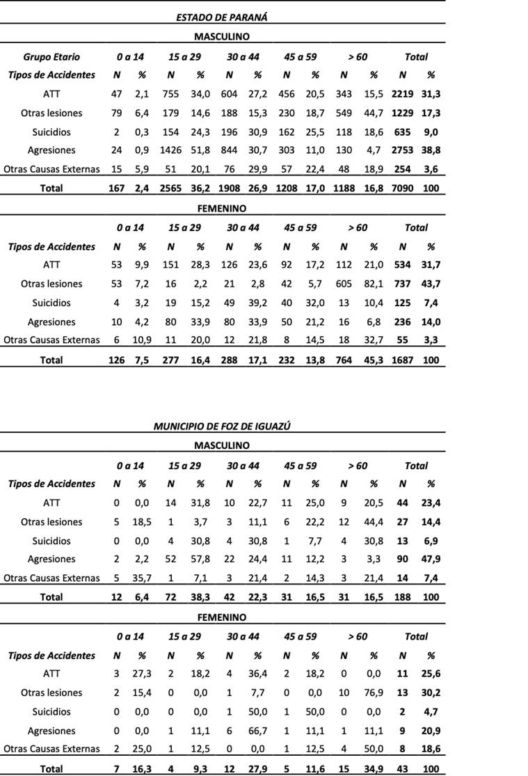 En la Tabla 3 al inicio del estudio se observa que en el Estado de Paraná la causa de muerte más importante en los dos sexos es Accidentes de tránsitos terrestres (ATT), Foz de Iguazú, agresiones corresponde el 55,2% de los óbitos en el sexo masculino y ATT el 61,5% de los óbitos en el sexo femenino, cabe importante mencionar que en el año 1996 en los dos sexos el grupo etario más afectado es el de 15 a 29 años de edad. La Tabla 4 del año 2016, tanto en el Estado de Paraná como en el Municipio de Foz de Iguazú en el sexo masculino la causa más importante de muerte es agresiones en las edades de 15 a 29 años y en el sexo femenino es otras lesiones en edades de 60 años y más.