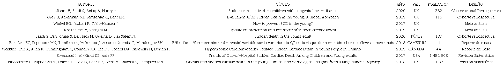 Resultados: De los 13 artículos para esta revisión con respecto a la muerte súbita cardiaca en adolescentes se encontró una variedad de causas o factores de riesgo que hicieron desencadenar esta patología encontrando entre estas ciertas causantes con mayor repetición.