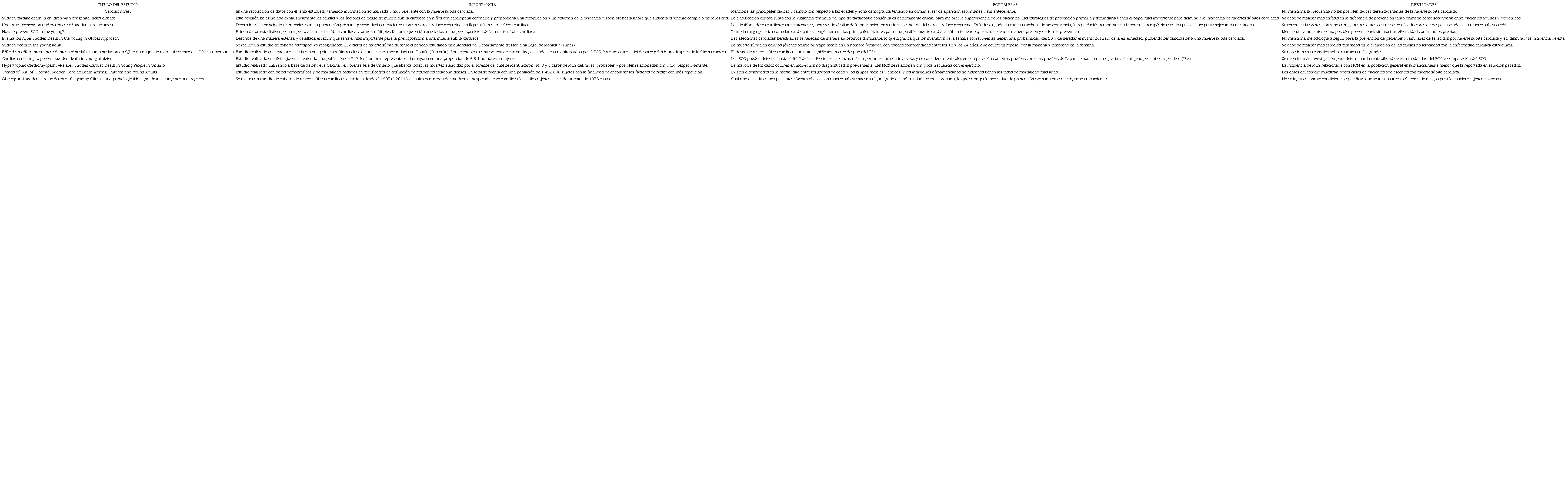 Gherardo Finocchiaro y colaboradores realizaron un estudio de tipo cohorte retrospectiva teniendo una población de 1033 casos los cuales se disponía información sobre el IMC, la demografía del fallecido, los antecedentes médicos, los antecedentes familiares, los síntomas cardíacos y las circunstancias de la muerte. Doscientos doce individuos (20 %) eran obesos. En las víctimas obesas de MSC, los principales hallazgos post mortem fueron: corazón normal (síndrome de muerte arrítmica súbita), hipertrofia ventricular izquierda inexplicable y enfermedad arterial coronaria crítica(EAC). Menos frecuentes fueron la miocardiopatía hipertrófica y la miocardiopatía arritmogénica del ventrículo derecho. En comparación con las víctimas de MSC no obesas, el síndrome de muerte arrítmica súbita fue menos común, mientras que la HVI y la enfermedad arterial coronaria crítica fueron más frecuentes. La prevalencia de enfermedad arterial coronaria crítica y no crítica fue significativamente mayor en individuos obesos. Los autores concluyeron que varias enfermedades cardíacas subyacen a la MCS en la obesidad, con una prevalencia relativamente alta de síndrome de muerte arrítmica súbita, HVI idiopática y CAD. Según la literatura, el grado de hipertrofia medido por el peso del corazón y el grosor de la pared en algunos pacientes obesos con SCD es excesivo incluso después de la corrección del tamaño corporal, dejando preguntas abiertas sobre una posible relación causal entre la HVI y las arritmias fatales en este contexto. Casi uno de cada cuatro pacientes jóvenes obesos con SCD muestra un cierto grado de EAC, lo que subraya la necesidad de prevención primaria específicamente en estos individuos14. En la Tabla 2 se presentan la importancia, fortaleza y debilidades de los 15 estudios seleccionados.
