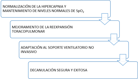 Las terapias de cuidados respiratorios no deben ser postergadas. Para obtener una satisfacción en la funcionalidad ventilatoria, deben ser considerados como opción preferente el soporte ventilatorio no invasivo (SVNI) complementado y favorecido por el protocolo de tos asistida manual y mecánicamente, antes de establecer la ventilación mecánica prolongada mediante la traqueotomía14,15.