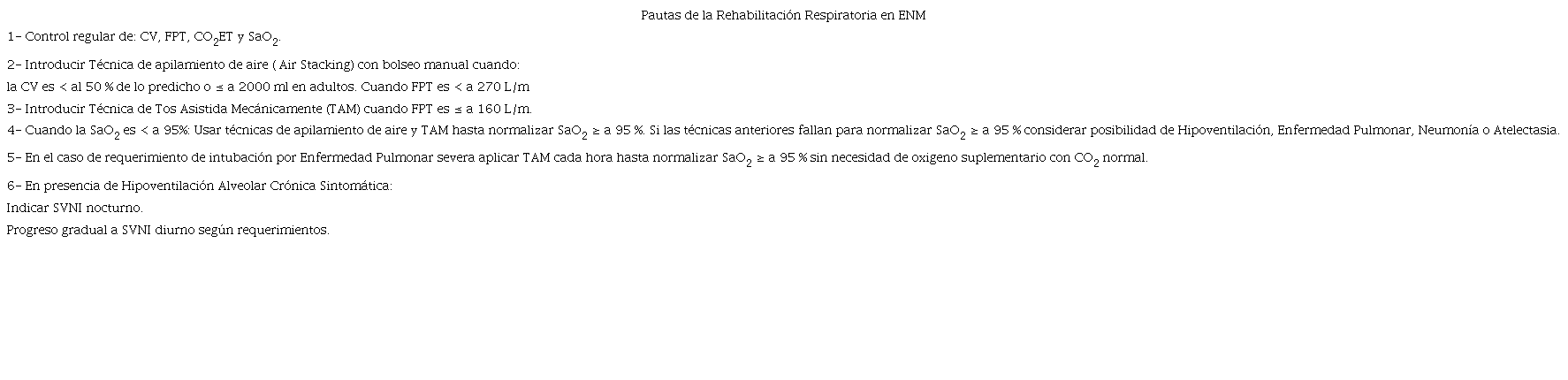 Fue derivada en nuestro hospital, donde recibió atención multidisciplinaria con asesoramiento de expertos internacionales en el tema, siguiendo las pautas de Rehabilitación respiratoria en Enfermedades Neuromusculares (ENM) estudiadas y publicadas por Bach JR y Cols. (Tabla 1). Iniciando su seguimiento por nuestro equipo, donde fue entrenada para el uso del bolseo manual para asistir la tos con la técnica de air stacking, ya que presentaba tos no funcional con flujo pico tosido (FPT) bajo (FPT < 160 l/m) y niveles altos de dióxido de carbono espirado (CO2ET, 50 mmHg), una vez a normalizada la hipercapnia, se inició la oclusión seriada de la traqueostomía según tolerancia, interrumpiéndose el seguimiento por internación hospitalaria debido a un cuadro respiratorio infeccioso grave. Volviendo al seguimiento se constata disminución notoria de la Capacidad Vital, con una pérdida de más de 400 ml, en evaluaciones previas presentaba una CV superior a 1000 ml, motivo por el cual se insistieron con el entrenamiento de las técnicas de re expansión pulmonar y asistencia de la tos con apoyo del Asistente Mecánico de la tos (AMT) (Tabla 2).