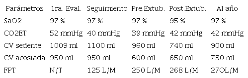 Un año posterior al inicio de su seguimiento por nuestro departamento, con niveles mejorados de FPT y CV, saturación arterial de oxigeno (SaO2) normal y CO2 ET fue decanulada en forma exitosa (Figura 1), continuando con ventilación nocturna a través de soporte ventilatorio no invasivo (SVNI) con equipo binivelado de presión y uso diario del AMT, siendo los valores de flujo pico tosido máximo alcanzado de 200 a 250 L/M, con una capacidad vital (CV) de 950 ml, presentando valores normales CO2ET y SaO2. Posteriormente a la decanulación se sigue insistiendo con el uso del AMT, además del apilamiento de aires, con lo cual va mejorando su CV y manteniendo valores normales CO2ET y SaO2 (Tabla 2).