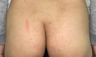 Paciente de 36 años de edad, de sexo femenino, sin patología de base conocida, acude a consulta por cuadro de dolor lumbar de inicio insidioso, de 3 semanas de duración, que con el paso de los días se fue intensificando, irradia a miembros inferiores: el derecho hasta la región posterior del tobillo y el izquierdo hasta cara posterior del muslo, siendo en este último de menor intensidad, cede parcialmente con analgésicos comunes; se acompaña de parestesias en ambos miembros. Refiere que hace 3 meses presentó cuadro similar, pero de menor intensidad; además como antecedente relevante dolor lumbar, lumbociatalgia bilateral y paresia de ambos miembros, de aproximadamente 3 meses de duración, posterior a una apendicectomía. Al examen físico de la región lumbosacra: simétrico, sin abombamiento, leve cambio de coloración en región sacra, negruzco apenas visible, con desviación del pliegue interglúteo (Figura 1).