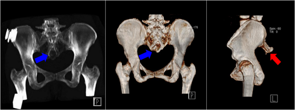 A la palpación: sacro con terminación truncada, no se palpa cóccix. De los miembros inferiores: lado derecho con sensibilidad disminuida en territorio S1, fuerza muscular 5/5, reflejos osteotendinosos presentes y conservados, Lasegue negativo; lado izquierdo sin datos de valor. Se solicita tomografía axial computarizada (TAC) simple y resonancia magnética nuclear (RMN) sin contraste de columna lumbosacra. En TAC llama la atención anomalía anatómica sacrococcígea caracterizada por abertura de canal raquídeo y ausencia de cóccix (Figura 2). En la RMN se observa situación baja del cono medular, siringomielia e hiperintensidad a nivel del filum terminal sugestivo de lipoma (Figura 3).