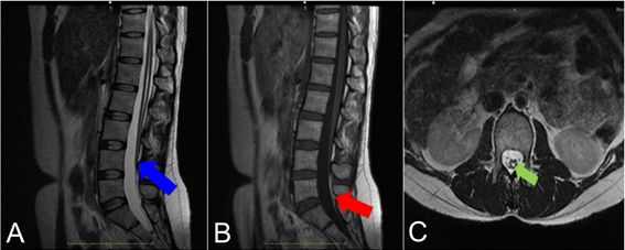 A. Se observa cono medular distal que termina a la altura de porción superior de L4, en T2 (flecha azul). B. Hiperintensidad en T1 a nivel del filum terminal, en relación con lipoma (flecha roja). C. dilatación del canal ependimario (flecha verde).