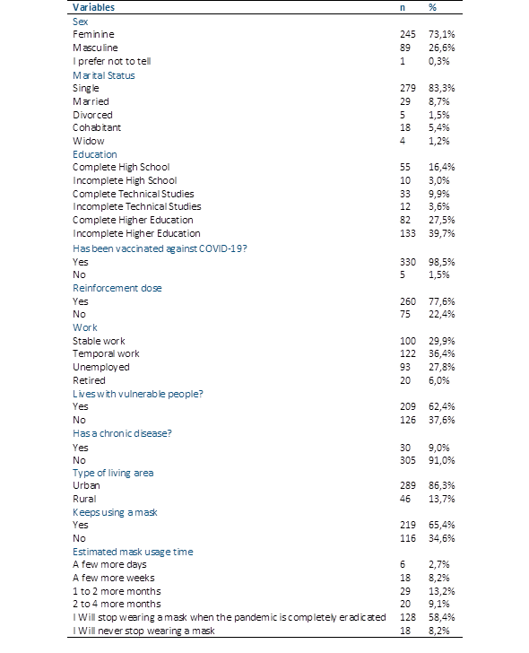 Participants: A total of 335 people with an average age of 26.11 years (SD= 10.02), selected by non-probabilistic sampling, participated in the study. Inclusion criteria were: 1) to be residents of Peru; 2) to be over 18 years of age; and 3) to give informed consent. Most participants were women (73.1%). In addition, most participants reported being single (83.3%) and having completed or incomplete university studies (67.2%). 98.5% indicated having been vaccinated against COVID-19 and 77.6% were vaccinated with their booster doses. 62.4% live with vulnerable people and 91.0% do not suffer from chronic diseases. Regarding the work environment, 29.9% indicated having a permanent job and 36.4% a temporary job. Regarding the use of masks, the majority (65.4%) continue to wear masks in open and closed places with ventilation, even though this was no longer obligatory at the time of the study. Finally, more than 50% of the participants (58.4%) indicated that they will stop wearing masks when the pandemic is totally eradicated. Table 1 reports in more detail the sociodemographic and health characteristics of the sample.
