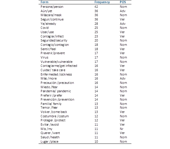 After the lemmatization, the analysis of the 217 text segments resulted in a total of 108 active forms (adjectives, names, and verbs). The following table shows the first 33, with a frequency of ≥10 which show semantic relevance related to the monothematic corpus (Table 2).