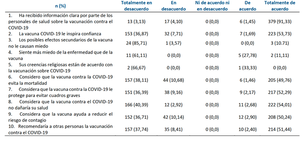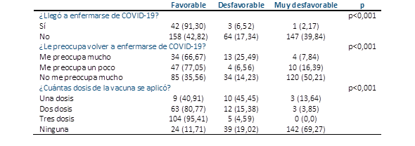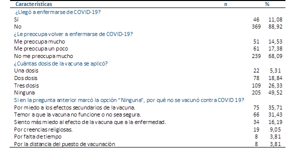 El 11,08 % contrajo COVID-19, al 68,09 % no le preocupa mucho volver a enfermarse de COVID-19. El 49,52 % no tiene ninguna dosis de la vacuna COVID-19, la mayoría de ellos debido al miedo a los efectos secundarios (Tabla 2). La percepción hacia la vacunación COVID-19 fue favorable en 201 sujetos (48 %) y muy desfavorable en 148 (36 %). No están de acuerdo con la vacunación COVID-19 por sus creencias religiosas (66,67 %), sienten temor sobre los efectos secundarios (85,71 %), han recibido información del personal de salud (91,33 %) (Tabla 3).