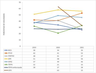 En el año 2019 la cobertura de vacunación de BCG en recién nacido fue del 38 %, 34 % en el 2020 y en el 2021 fue 26 %. La vacuna PCV13, refuerzo al 1 año, tuvo cobertura del 42 % en el 2019, 41 % en el 2020 y en el 2021 fue 53 %. La Penta 3 tuvo 38 % de cobertura en el 2019, 41 % en el 2020 y en el 2021 fue 27 %. La vacuna SPR primera dosis, tuvo 51 % de cobertura en el 2019, en el 2020 58 % y en 2021, 56 %. Durante el año 2019 la vacuna SPR 2 aplicada a los 4 años, registro 37 % de cobertura, 49 % en el 2020, y en el 2021 fue 46 %. La vacuna TDPA en niños de 10 años, tuvo 32 % de cobertura durante el año 2019, 21 % en el 2020 y 33 % en el 2021. En el año 2019 se realizó 28 % de cobertura de la TDPA en embarazadas, 27 % en el 2020 y en el 2021, 28 %. Sobre el esquema de vacunación de la VPH segunda dosis, se completó el 65 %, en niñas de 10 a 14 años en el 2019, 63 % durante el 2020 y en 33 % en el 2021. La vacuna TD fue aplicada a 393 indígenas de 7 a 59 años sin antecedentes de vacunación en el año 2019, en el 2020 a 203 indigenas y en el 2021 a 211 indigenas. La vacuna contra la Influenza en el 2019 se registró que 4995 indígenas la recibieron, en el 2020, 2856 pobladores indígenas y 2235 durante el año 2021 (Gráfico 2).