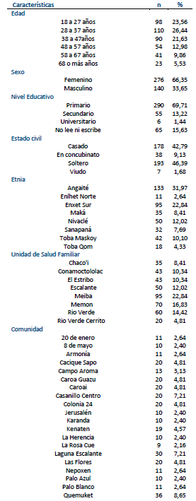 Se observó que 110 (26,44 %) de los indígenas tuvieron entre 28 a 37 años, 276 (66,35 %) fueron del sexo femenino, 133 (31,97 %) correspondieron a la etnia Angaité, 290 (69,71 %) poseían estudios hasta el nivel primario y 178 (42,79 %) fueron de estado civil soltero (Tabla 1).