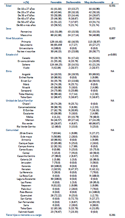 La percepción varió según las etnias (los Angaité tenían una posición menos favorable), según el nivel académico (más favorable en los más educados), según el estado civil (más favorable en los solteros). Sin embargo, no varió según el sexo, la edad, o el tener hijos (p>0,005) (Tabla 4). Aquel que ya se enfermó por COVID-19 tuvo una postura más favorable, así como los que manifestaban preocupación por volver a enfermase. Los que no se vacunaron tuvieron una percepción menos favorable hacia la vacuna (Tabla 5).