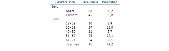 Consultaron 240 pacientes de los cuales se incluyeron 113 que se sometieron a tratamiento endovascular con lo que la frecuencia de este tratamiento en patologías cerebrovasculares fue de 47,08 %. El 60,2 % fueron mujeres. Las edades estuvieron comprendidas entre los 18 y los 81 años con una media de 54 ± 16 años y una mediana de 56 años. La edad más frecuente fue 64 años. El promedio de edad entre las mujeres fue de 56,2 años y el promedio de edad en hombres de 50,4 años. Estos datos demográficos se detallan en la Tabla 1.