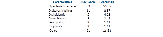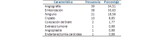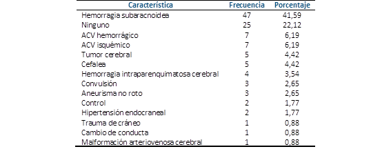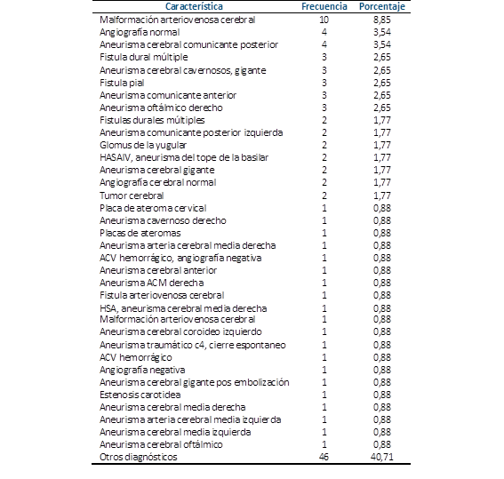 En cuanto a los diagnósticos se ve en la Tabla 4 que los más frecuentes son hemorragia subaracnoidea en el 41,59 %, angiografía normal en el 22,12 %, ACV hemorrágico en el 6,19 % y ACV isquémico en el 6,19 %, tumor cerebral en el 4,42 % y cefalea en el 4,42 %. En cuanto a las comorbilidades el 73,45 % tiene algún tipo de comorbilidades. Estas se detallan en la Tabla 5. En cuanto al tratamiento se ve en la Tabla 6 que los más frecuentes fueron angiografía con 34,51 %, embolización en el 33,63 %, clipado en el 8,85 %, colocación se Stent 1,77 %.