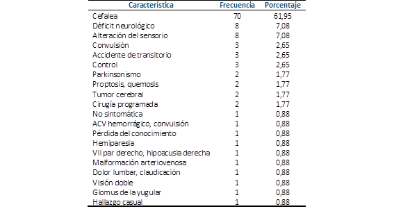 En cuanto a los datos clínicos la Tabla 2 presenta los hallazgos más frecuentes en las angiografías. Se puede ver que los hallazgos más frecuentes fueron malformación arteriovenosa cerebral, angiografía normal y aneurisma. En la Tabla 3 se presentan los motivos de consulta más frecuentes fueron cefalea con 61,95 %, déficit neurológico con 7,08 %, alteración del sensorio 7,08 %, convulsión 2,65 %, accidente transitorio isquémico 2,65 %, control 2,65 % y parkinsonismo en el 1,77 %.