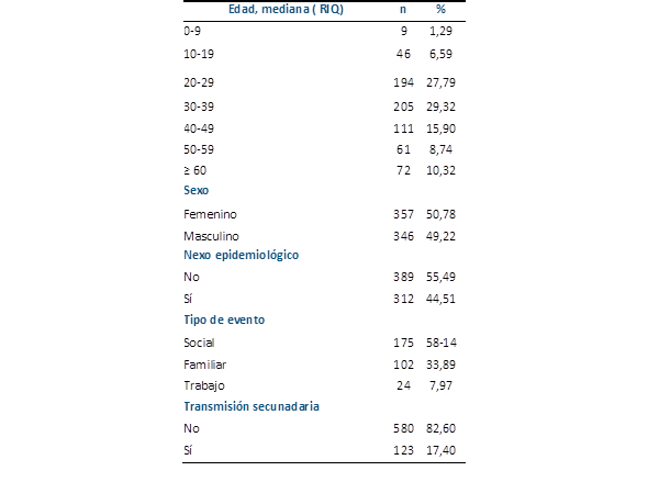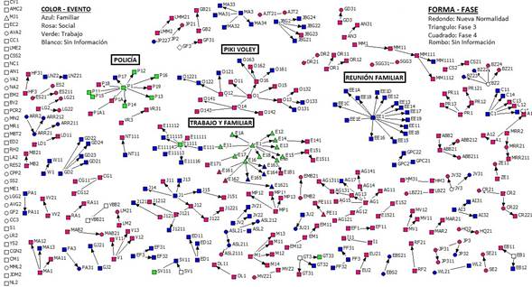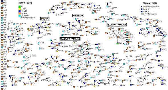 Resultados: Fueron identificadas 703 personas con Sars-Cov-2 positivo. El 55,49 % de las personas no reconoció algún nexo de contagio. Con respecto al tipo de evento donde ocurrían con mayor frecuencia los contagios, ocurrieron en Eventos Sociales en 58,14 % de los casos y en el Ambiente Familiar en el 33,89 %. La transmisión secundaria se observó en el 17,40 % de los casos. Fueron identificados 58 Clústers, con una mediana de tamaño de los mismos de 3 (RIQ 2-4), y 267 personas (37,98 %) asociadas a los mismos.