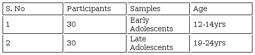 The sample consists of 30 Early adolescents, and 30 Late adolescents taken from different schools, colleges and workplaces. People with illness, visual impairment, disabilities were not considered as subjects for this research project.