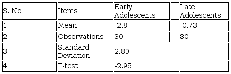 The results prove the hypothesis that there is a significant difference in Serial Learning and positioning between the Early and Late Adolescents as seen in the samples. Furthermore, Late Adolescents have higher recalling ability when it comes to serial learning and positioning compared to that of Early Adolescents. Through the t-test we found that the null hypothesis is rejected which means that the Late adolescent’s cognitive development is higher than Early Adolescents.