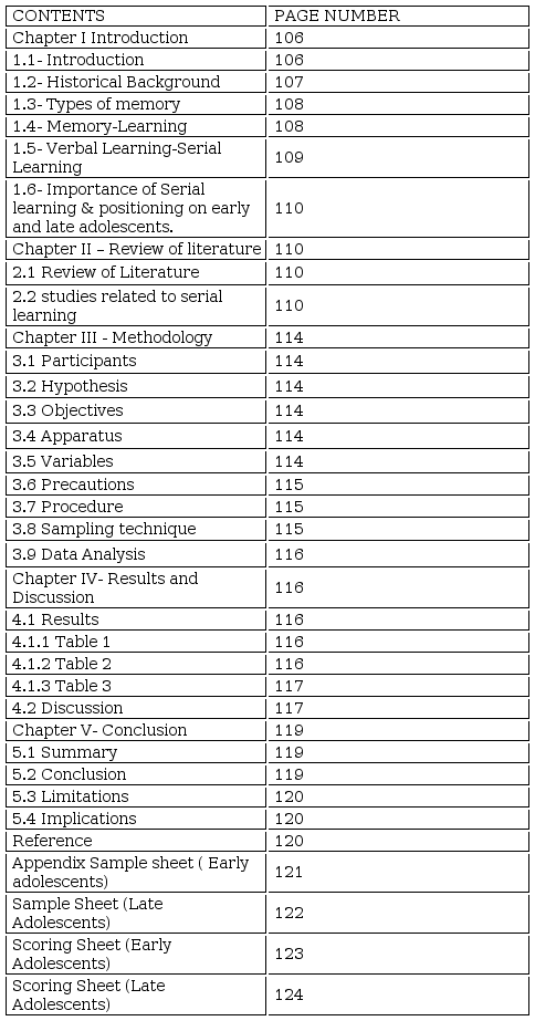 Therefore, this thesis deals with how there was a significant difference between early adolescents and late adolescents during the serial-learning and positioning of words in association with their memory. It is also a compilation of all the aspects associated with Learning and Memory with relation to time. The aim of the study is to prove that Late Adolescents have higher learning memory compared to the Early Adolescents.