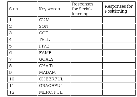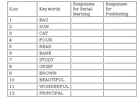 Materials used in this experiment are a list of 24 simple words that people use in everyday life. The 24 set of words were divided into two different sets with 12 in each set. The apparatus was designed by the experimenter.