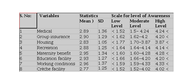 While the score value greater than (+ SD) was classified as high-level awareness and the score value less than ( - SD) was classified as low-level awareness respectively and the score values between ( + SD) and ( - SD) have been classified as medium level awareness. Here to find the arithmetic means and standard deviation (SD) of the score values of 347 respondents were calculated shows the mean, standard deviation and scale to gauge the degree of mindfulness for every factor i.e., the government assistance plans accessible to the beedi laborers. The current examination further explores the degree of mindfulness regarding this table, under different heads of plans which structure the factors of our investigation, to be specific, clinical strategies, protection plans, lodging, training, entertainment, maternity, working conditions, and crèche office.