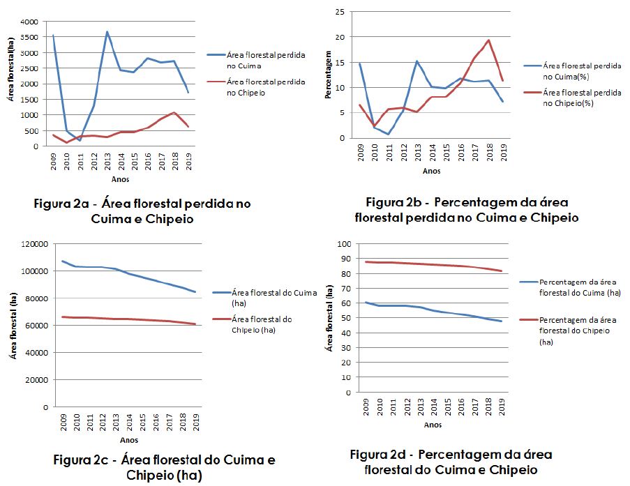 Como se pode ver nas figuras 2a-d, a comuna do Cuima teve maiores perdas de área florestal nos anos de 2013 e 2009, sendo que os anos em que menor perda de área florestal registrou foram os de 2011 e 2010. Já a comuna do Chipeio registrou maiores perdas de área florestal nos anos de 2018 e 2017, tendo sido os anos de 2010 e 2009 os que apresentaram menor perda de área florestal.