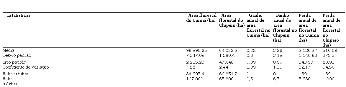 Como mostra a tabela acima, a área florestal das comunas do Cuima e Chipeio no período analisado foi, em média, de 96.898,95 e 64.052,2 ha, respectivamente, sendo que a amplitude, isto é, a diferença entre o valor máximo e mínimo, foi de 22.306,6 ha para o Cuima e 4.948,8 ha para o Chipeio. A variabilidade entre ganho e perda de área florestal foi muito maior na comuna do Cuima.