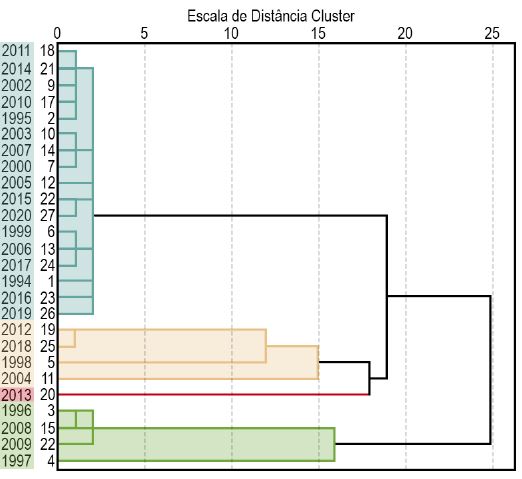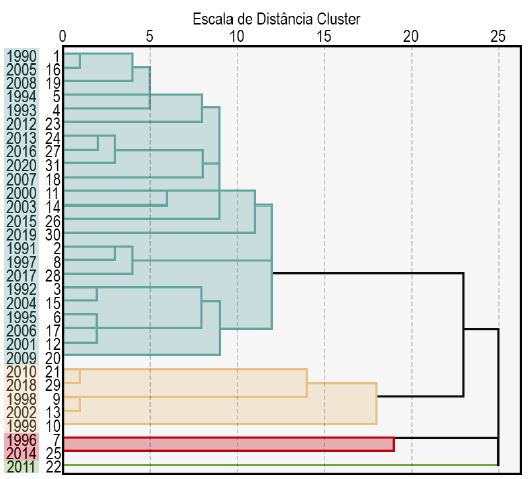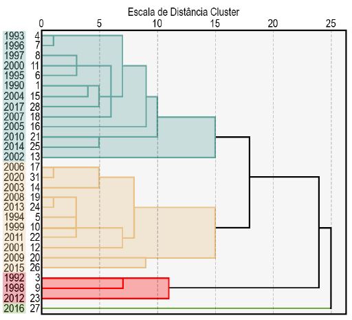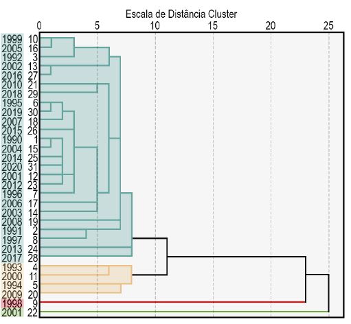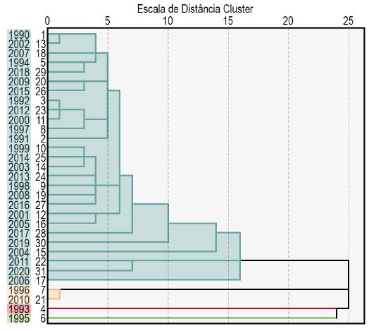 Com o objetivo de analisar o comportamento do ano de 2020 em relação aos demais 29 anos coletados, foi feita uma Análise de Cluster Hierárquica. A Análise de Cluster agrupa as variáveis em grupos semelhantes, de forma que os pertencentes a um grupo são os mais parecidos quanto possível uns com os outros, assim como os grupos diferentes são dissimilares, conforme Valli (2012) explica. O agrupamento hierárquico dos dados permite, dessa forma, identificar comportamentos semelhantes ou outliers dentre as variáveis analisadas. A Análise de Cluster foi realizada no recorte de 30 anos, buscando identificar comportamentos similares ou dissimilares, divididos em cinco agrupamentos de clusters, de forma hierárquica em cada cidade. A análise é feita de modo a agrupar variáveis similares em clusters que são representados através de um dendograma, que é a forma mais usual de representação dos resultados de algoritmos hierárquicos e mostra intuitivamente a ordem do agrupamento. Quanto mais alta a linha ligando dois clusters, mais tarde foi feito seu agrupamento. Logo, a altura da linha ligando dois clusters é proporcional à sua distância (Linden, 2009). Dessa forma, a linha de distância euclidiana demonstra, conforme a maior ou menor distância, a similaridade dos clusters entre si. Com base nisso, tentou-se identificar se o ano de 2020, no período determinado de aquisição de dados, se demonstrou atípico em relação aos outros anos, devido ao isolamento social provocado pela COVID- 19.