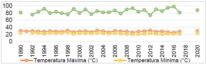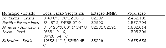 O estudo foi realizado com dados anuais de temperaturas e umidade obtidos em cinco estações meteorológicas situadas nos estados do Ceará, Pernambuco, Amazonas, Pará e Bahia. As medições foram feitas por meio de sensores de temperatura e umidade do ar que foram registradas pelas estações meteorológicas convencionais localizadas em cada cidade analisada e disponibilizadas por meio do banco de dados do INMET.