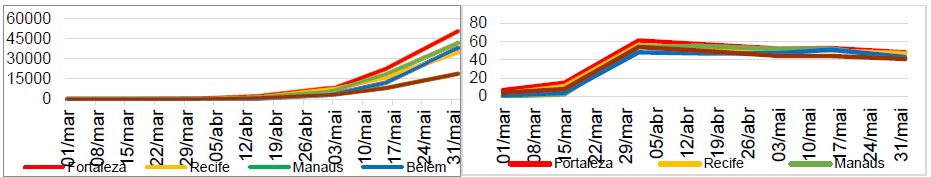A doença do Coronavírus no Brasil já acometeu mais de 400.000 pessoas (WHO, 2020a) e causou mais de 25.000 mortes, o que corresponde a aproximadamente 6% dos casos confirmados. O objeto de estudo da pesquisa foi definido de acordo com a identificação dos cinco estados mais afetados do país com dados meteorológicos disponíveis na data selecionada , que correspondem aos estados do Ceará, Pernambuco, Amazonas, Pará e Bahia (IHME, 2020). A Figura 2 representa a curva do número de casos confirmados nas cidades analisadas, assim como a curva das taxas de isolamento social alcançadas em cada estado. No que diz respeito à taxa de isolamento social, o valor máximo dentre as cidades correspondeu a 57% na cidade de Fortaleza, aproximadamente na quarta semana analisada. É importante ressaltar que as taxas de isolamento nos países em que a situação de pandemia foi controlada a exemplo da Itália, Espanha, Portugal, entre outros superaram os 80% de distanciamento (IHME, 2020), o que possibilita o debate para saber se as taxas de Isolamento Social no Brasil foram suficientes ou eficazes.