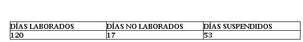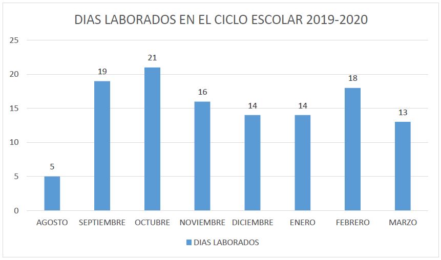 Fueron en total 120 días laborados hasta la suspensión de las actividades del ciclo escolar, provocado por la pandemia que afecto a nivel mundial, trabajando en ocho de los doce meses contemplados de actividades.