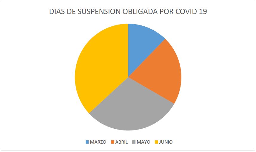 Fueron en total 57 días que se determinó suspender por el aislamiento social que decretaron las autoridades, para prevenir el contagio del coronavirus (covid 19) y mitigar la propagación en gran cantidad de población estudiantil que se reúne en la escuelas, siendo el mes de marzo con siete días el mes con menos y en el mes de junio se tenían contemplados veintiún jornadas de trabajo, siendo el mes con más jornadas suspendidas del ciclo escolar.