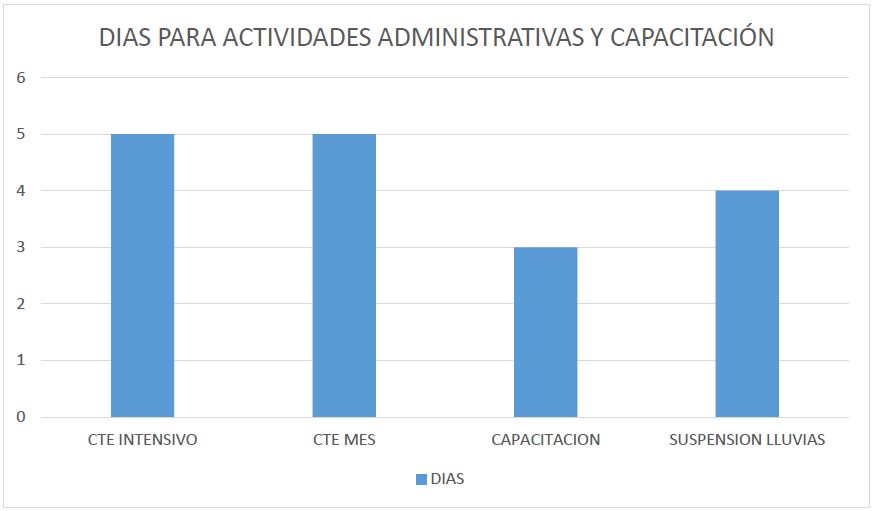 En el calendario se contemplan otras actividades a realizar durante los cinco días de la semana laboral, los cuales fueron cinco días en el mes de agosto de consejo técnico escolar intensivo, mas cinco días de manera ordinaria acomodados en algunos meses, de los cuales dos de ellos fueron realizados entre niveles educativos con otras escuelas, hubo tres sesiones de capacitación para la implementación de la normatividad en educación básica con orientaciones jurídicas y protocolos de actuación aplicables en las instituciones educativas, cuatro días suspendidos por lluvias, así como baja asistencia de estudiantes en los salones: los días del carnaval, la convocatoria de un día sin mujeres y otros dos días lluviosos donde no se decretó la suspensión.