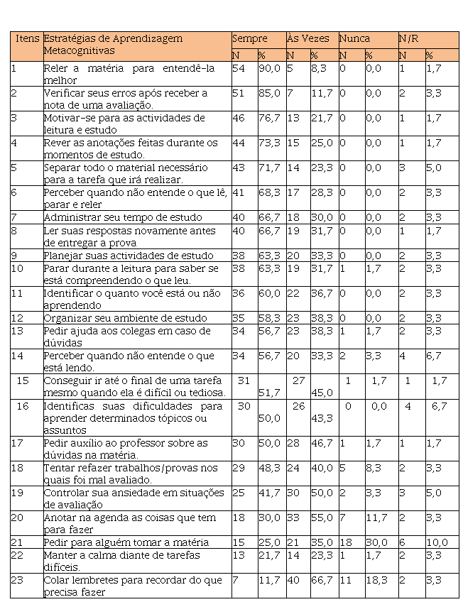De seguida, na Tabela 2, apresentam-se as frequências e respectivas percentagens sobre o uso de estratégias metacognitivas. Em função destes resultados, as estratégias que apresentam maior frequência e utilizadas sempre pela maioria dos participantes foram: reler a matéria para entendê-la melhor (90%), motivar-se para as actividades de leitura e estudo (76,66%), rever as anotações feitas durante os momentos de estudo (73,33%), separar todo o material necessário para a tarefa que irá realizar (71,66%.). E dentre as estratégias metacognitivas que nem sempre são utilizadas pelos participantes, destaca-se a estratégia pedir ajuda aos colegas em caso de dúvidas (56,66%) . pedir auxilio do professor (50%).