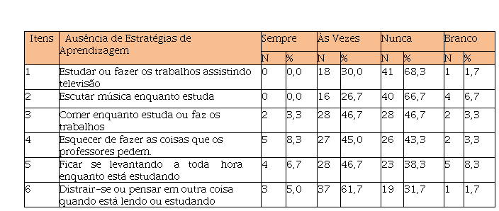 Finalmente, a Tabela 3 apresenta as frequências e respectivas percentagens sobre ausência de comportamento estratégicos (ausência de estratégias de aprendizagem) por parte dos participantes.