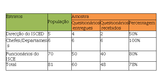 Para este trabalho a população alvo é constituída por cinco membros da direcção do ISCED, seis chefes de Departamentos e 70 funcionários (docentes, investigadores e administrativos).
